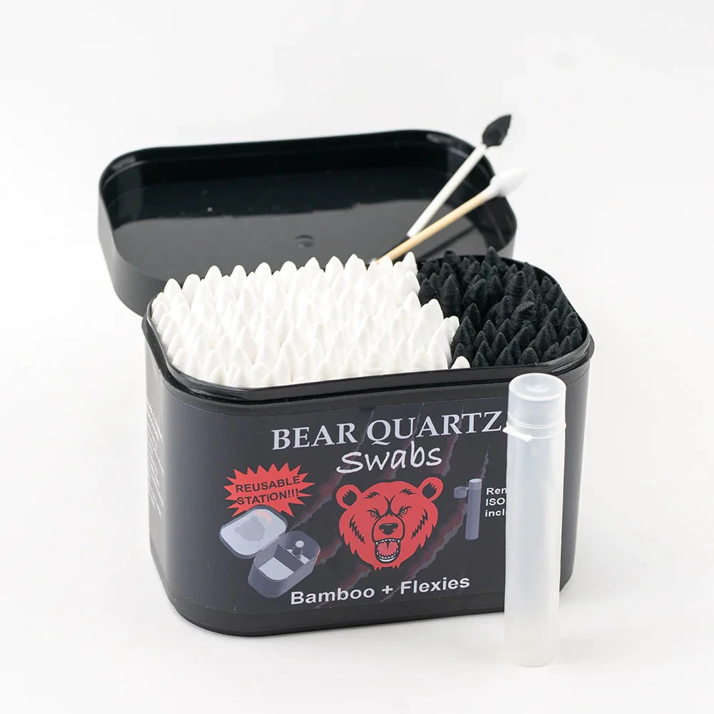 Ravage & clean through that sticky banger with the Bear Quartz Combo Swabber. Features: 2/3 Bamboo Swabs For Coverage & Deeper Cleaning 1/3 Flexies For Hard To Get Areas Removeable Iso Tube Included(Iso Not Included)
