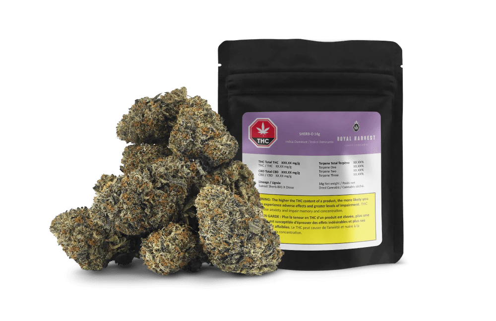 Available for a limited time only. Sherb-O is a potent Indica dominant offering exclusively cultivated by Royal Harvest, and bred in the Okanagan. Sherb-O combines a Sunset Sherb BX1 with Oreoz, creating a flower with a uniquely complex flavour profile and stunning visuals. The flowers shimmer with trichomes with dark green buds with deep purple hues. The nose can be described as sweet earth and fuel, with complex sandalwood earth and pine notes melting into a sour citrus finish with honey lingering on the palette. These flowers deliver on both flavour and aesthetics for Royal Harvest devotees.